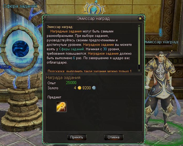 Найдите НИП Эмиссар наград, он находится в Асгарде (x510; z390) и в диких локациях, начиная с «Древнего холма». Один раз в день вы можете взять у него задание «Эмиссар наград», смысл которого состоит в том, чтобы выполнить несколько квестов «Сферы заданий» (x510; z396, Асгард). В качестве награды вы получите опыт и золото, а их количество будет зависеть от уровня вашего персонажа. Также вам выдадут «Золотой ключ». С его помощью вы сможете открывать золотые кубы. В них можно найти полезные предметы.